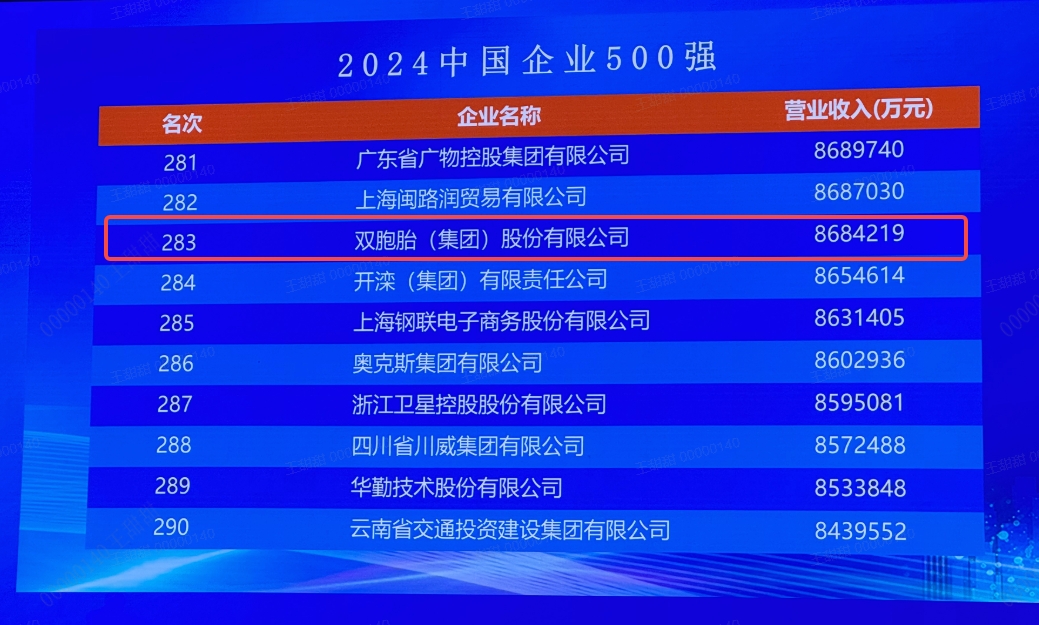 9月11日,中国企业联合会、中国企业家协会在天津召开2024中国500强企业高峰论坛全体大会,发布了2024中国企业500强相关榜单及其分析报告。双胞胎集团以2023年868亿的营业收入,位居中国企业500强榜单第283名,排名较去年提升4位!